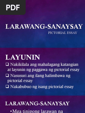 Makilala ang mga katangian ng mahusay na photo essay. Mga layunin sa paggawa Makapag-ambag sa patuloy na pag-angat at pagbabago ng agham at teknolohiya. Ibig sabihin isinasalaysay ang mga pangyayari ayon sa wastong pagkakasunod-sunod ng larawan.