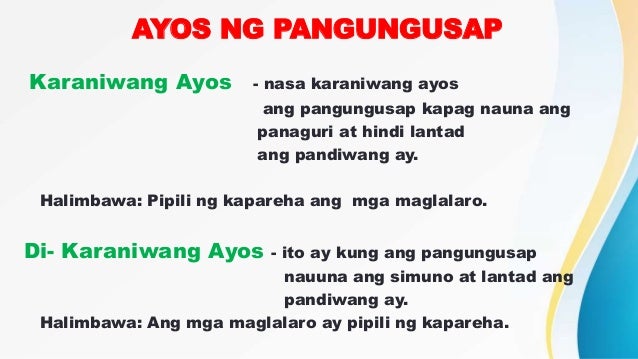 Halimbawa ng limang sa karaniwang ayos. Karaniwang ayos Ang bata ay ay umutang. 10 halimbawa ng karaniwang ayos Enter some text. Nasa di-karaniwang ayos ang pangungusap kapag nauuna ang simuno sa panag-uri.